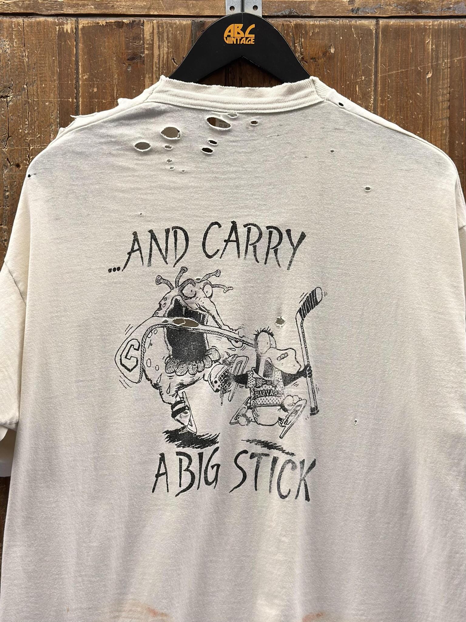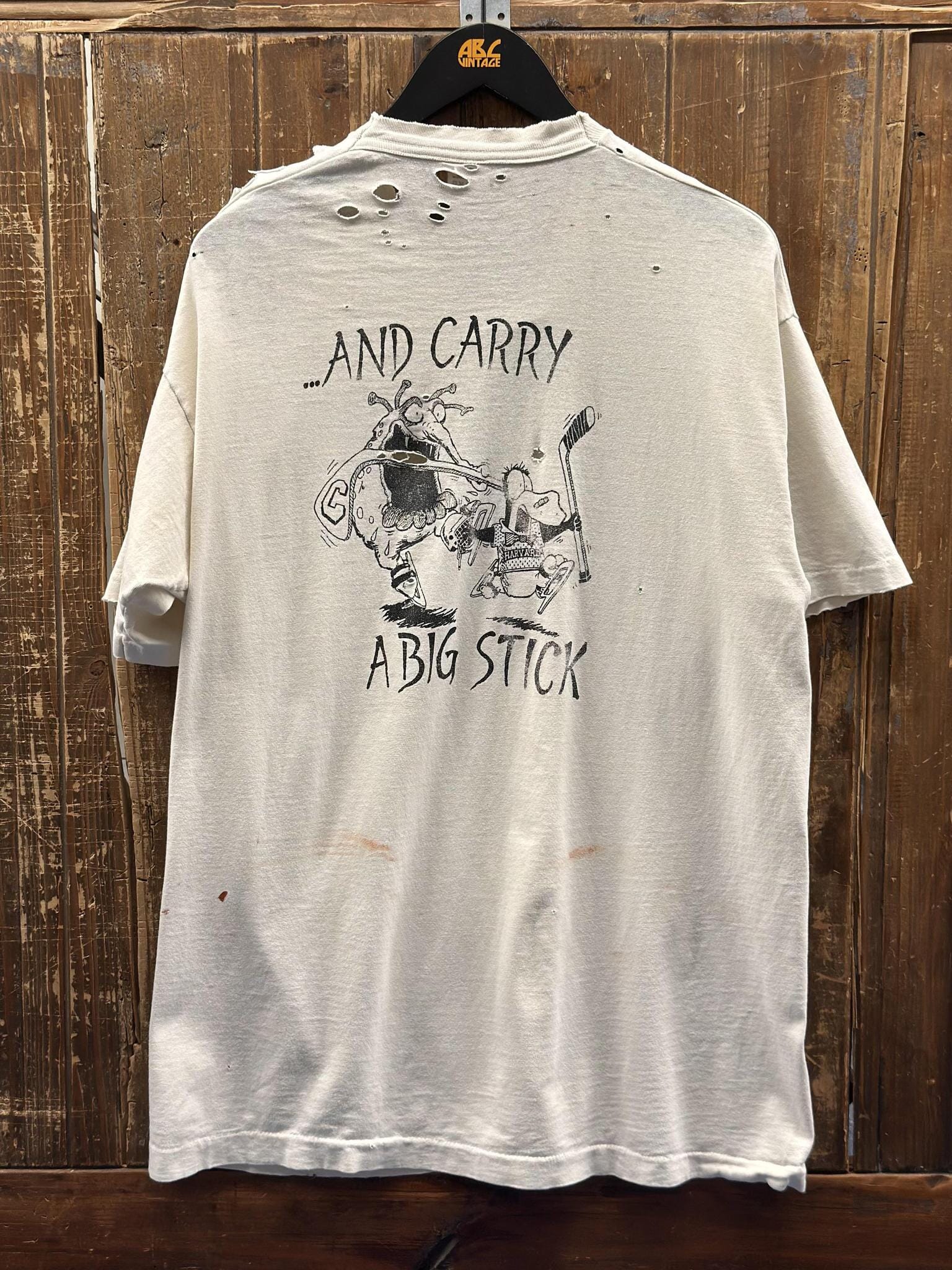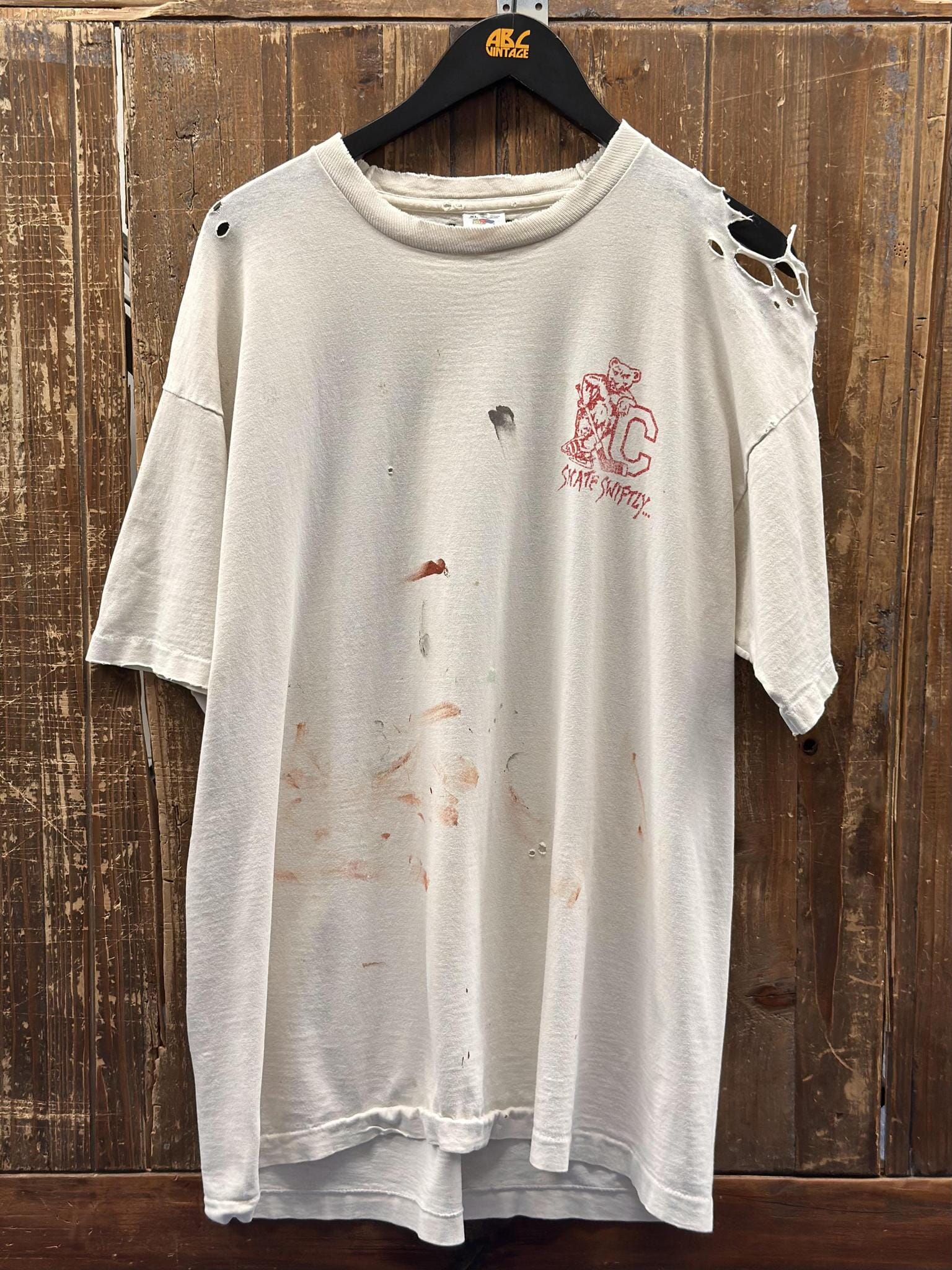 Skate Swiftly And Carry A Big Stick Vintage 90s College Thrashed Tee Painted Faded White